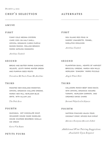 In addition, we offer optional wine pairings, expertly matched with wine selections collected from our thoughtfully curated and extensive wine list.